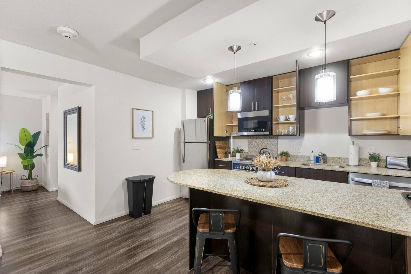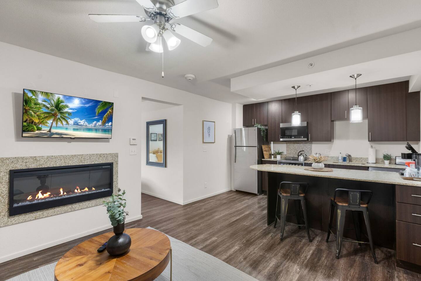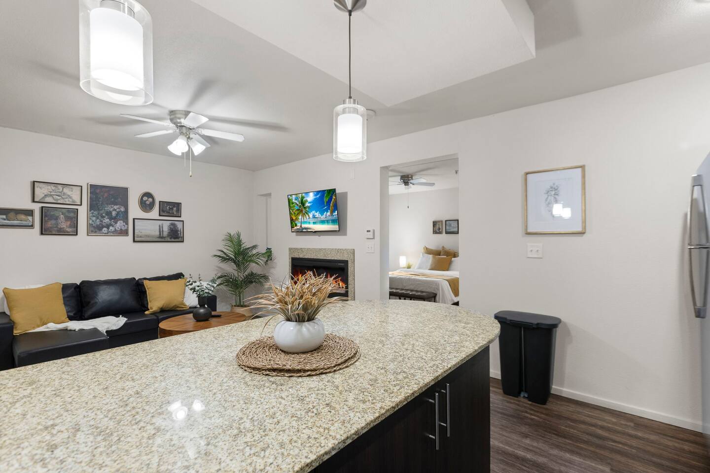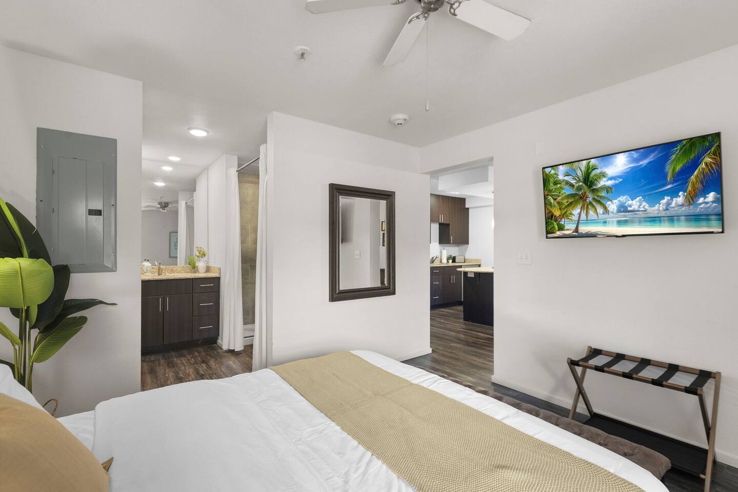 Welcome to this bright and stylish corner unit, offering a modern open-concept layout where the bedroom flows seamlessly into the main living space—perfect for a relaxed, airy vibe. Enjoy private off-street parking, a 55" 4K Roku TV, high-speed Wi-Fi, and a laptop-ready workstation. Stay fit in the on-site gym and relax in comfort with easy access to everything you need. Perfect stay for business or leisure travelers seeking comfort, convenience, and value. Book your stay now!