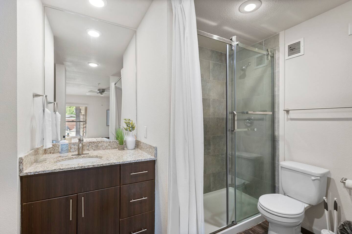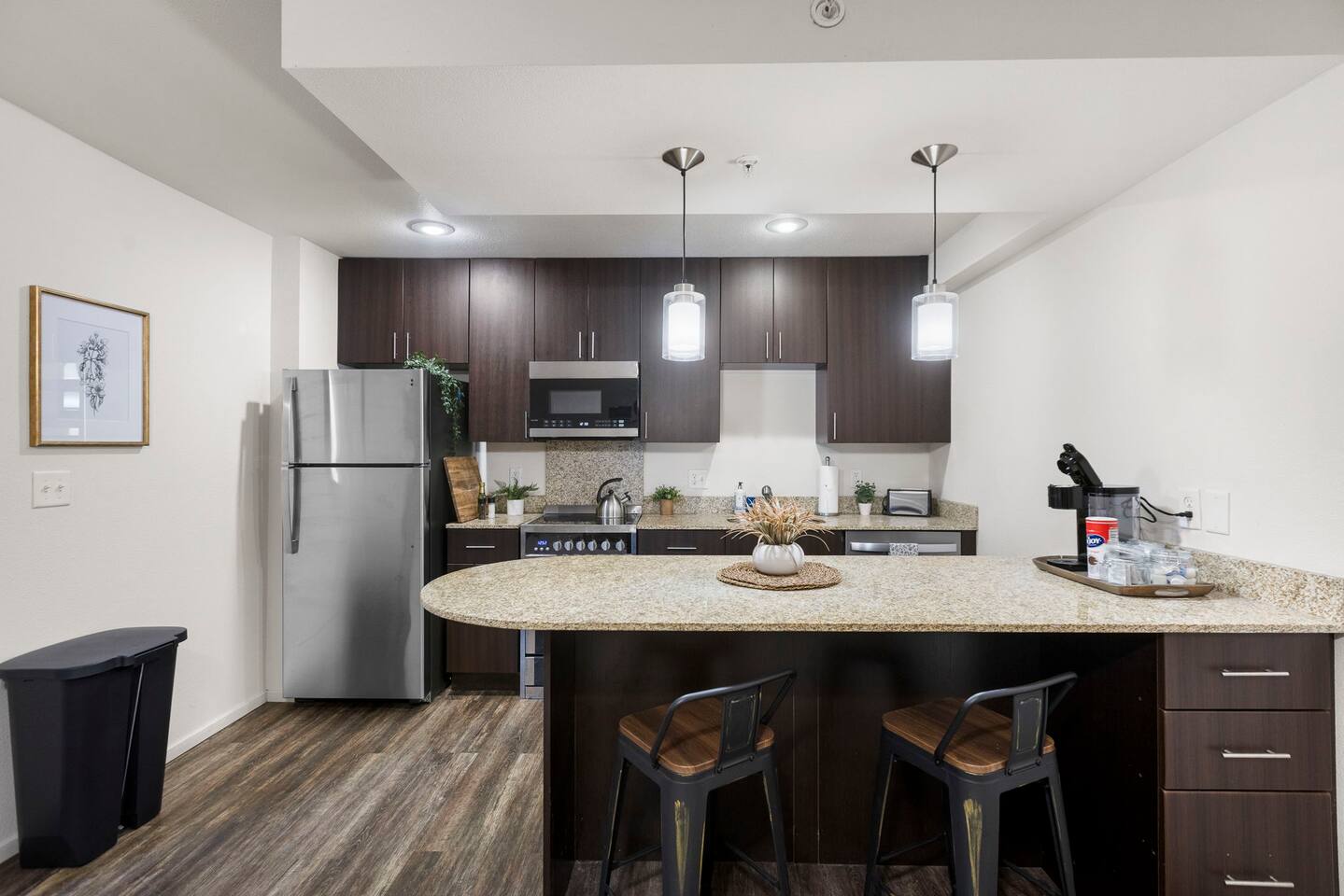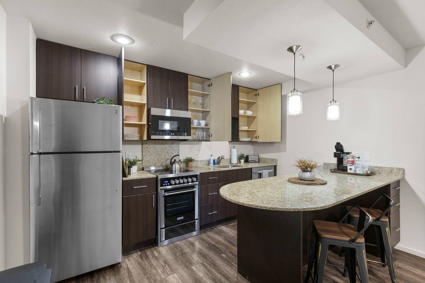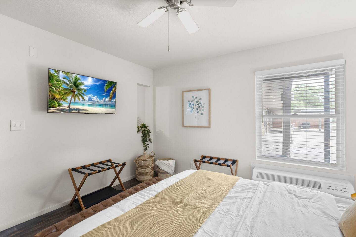 Welcome to this bright and stylish corner unit, offering a modern open-concept layout where the bedroom flows seamlessly into the main living space—perfect for a relaxed, airy vibe. Enjoy private off-street parking, a 55" 4K Roku TV, high-speed Wi-Fi, and a laptop-ready workstation. Stay fit in the on-site gym and relax in comfort with easy access to everything you need. Perfect stay for business or leisure travelers seeking comfort, convenience, and value. Book your stay now!