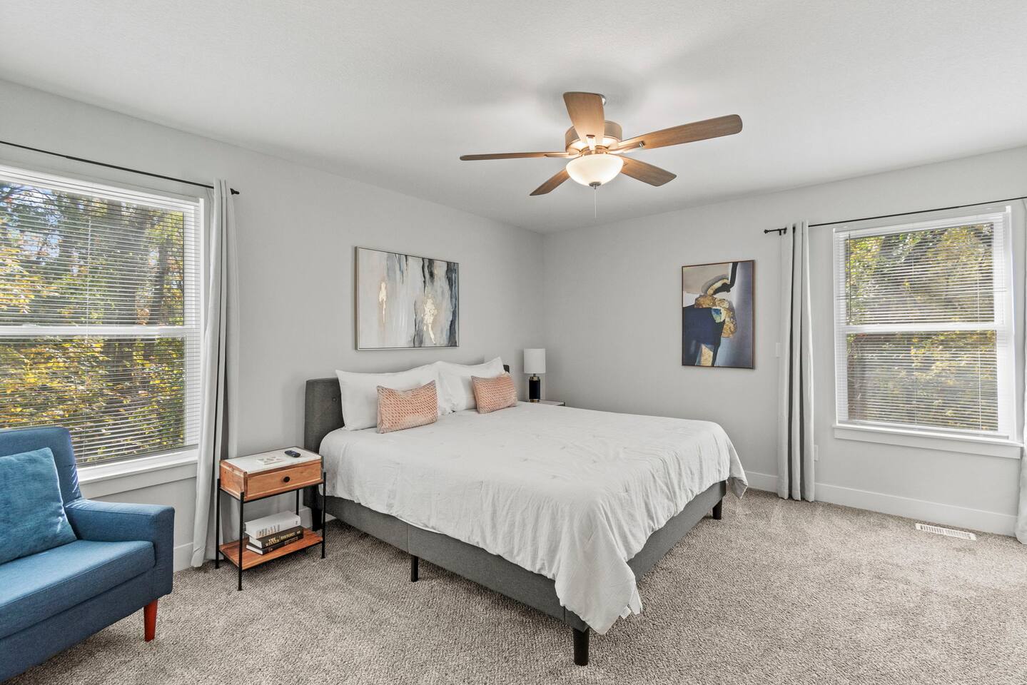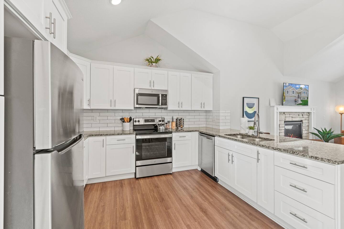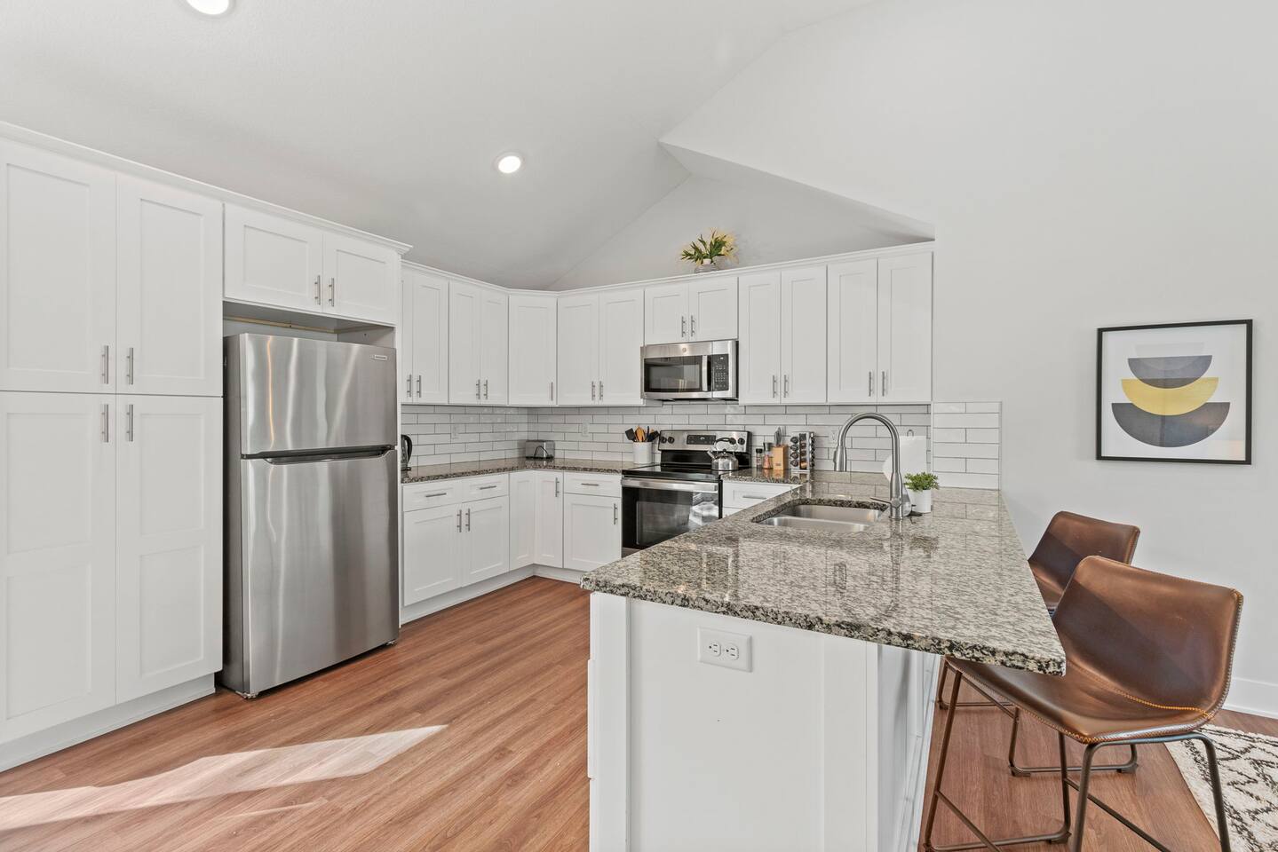 Welcome to your Modern Creekside Haven, a stylish 2-story split-level retreat designed for comfort and connection. ✨ 4 bedrooms, 2 bathrooms – sleeps up to 10 guests 🛏️ Basement: 1 Queen Bed + 1 Queen Sofa Bed 🛏️ Main Level: 1 King Bed + 2 Queen Beds + 1 Queen Sofa Bed 🔥 Decorative fireplace (non-operational) 🍳 Fully equipped kitchen with stainless steel appliances ☕ Coffee bar, bar seating, and spacious dining area 🌳 Elevated deck with wooded views and a quiet creek below 🚗 2-car garage + private driveway + free street parking (up to 4 vehicles total)