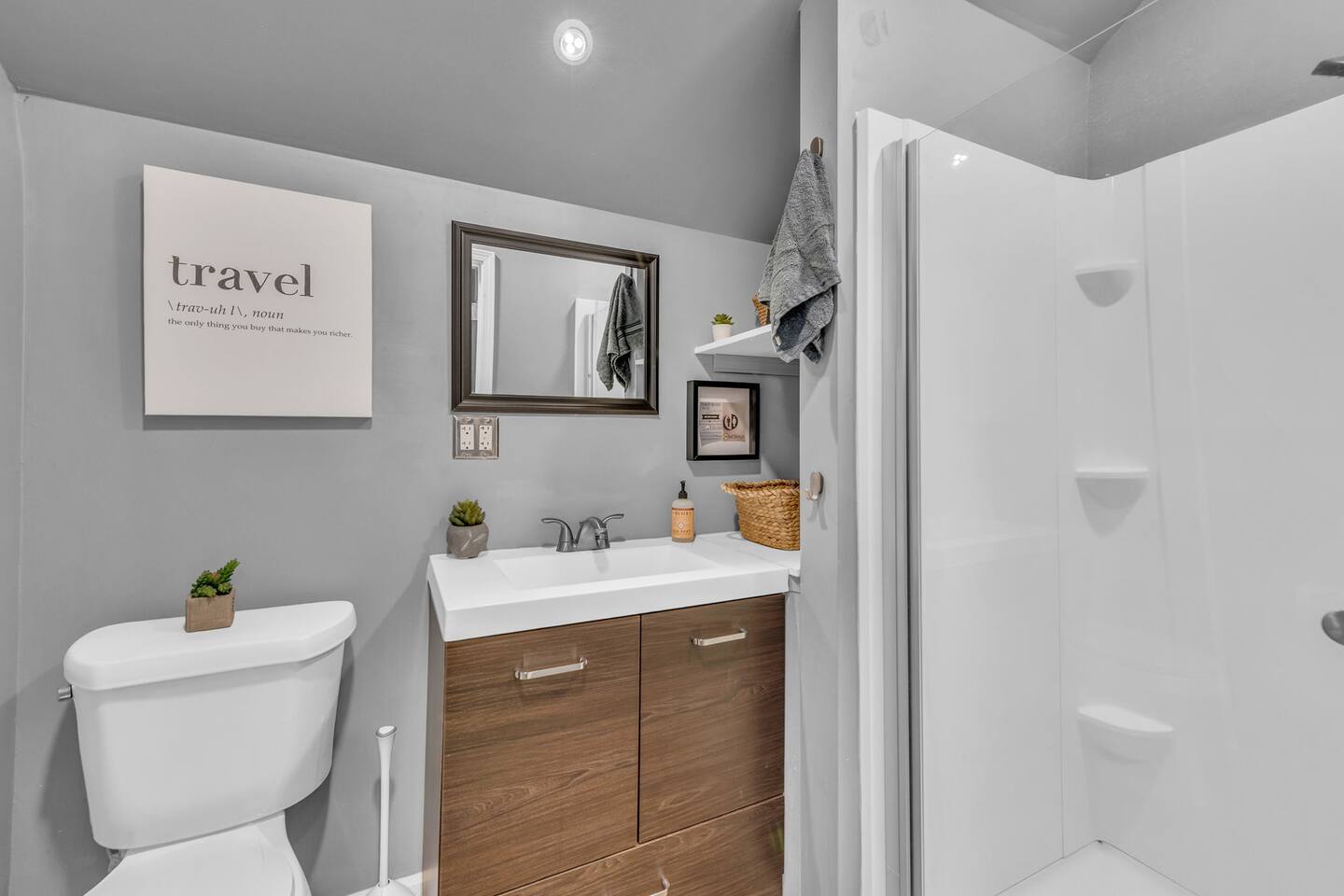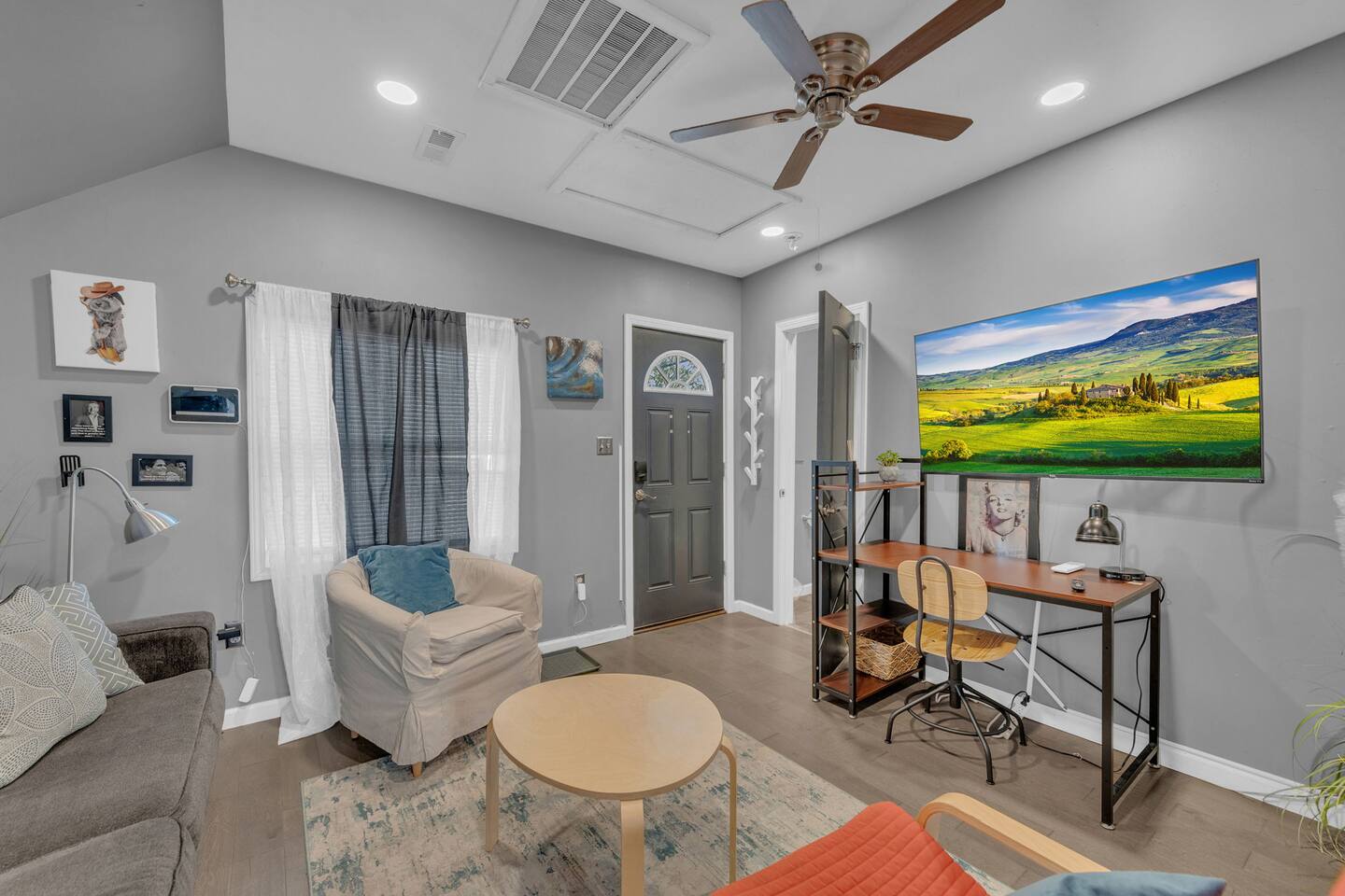 Welcome to your spacious garage apartment, offering the perfect blend of comfort and functionality. Nestled in a serene neighborhood, this 1-bedroom, 1-bathroom retreat promises a relaxing stay. As you step inside, you're greeted by a cozy living space adorned with modern furnishings. Sink into the plush king bed in the bedroom for a restful night's sleep, while additional guests can enjoy the convenience of an air bed in the living room. For those needing to stay productive, a dedicated workspace awaits below the TV in the living room, providing a quiet area to focus. Entertainment options abound with two TVs—one in the living room and another in the bedroom—ensuring everyone can unwind with their favorite shows or movies. Prepare delicious meals in the fully equipped kitchen, complete with all the essentials. And with free parking available right in front of the apartment, you can easily come and go as you please. Parking spot is located north of the house or the driveway is facing the church/Orville street. Whether you're here for business or leisure, this garage apartment offers the perfect retreat for your stay. Book now and experience comfort, convenience, and relaxation like never before.