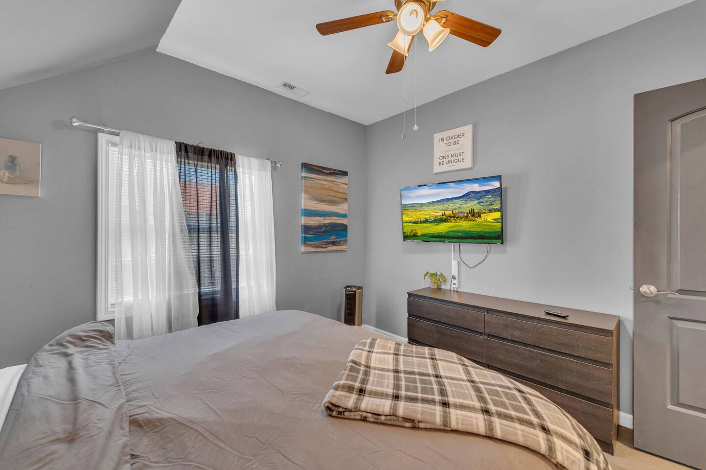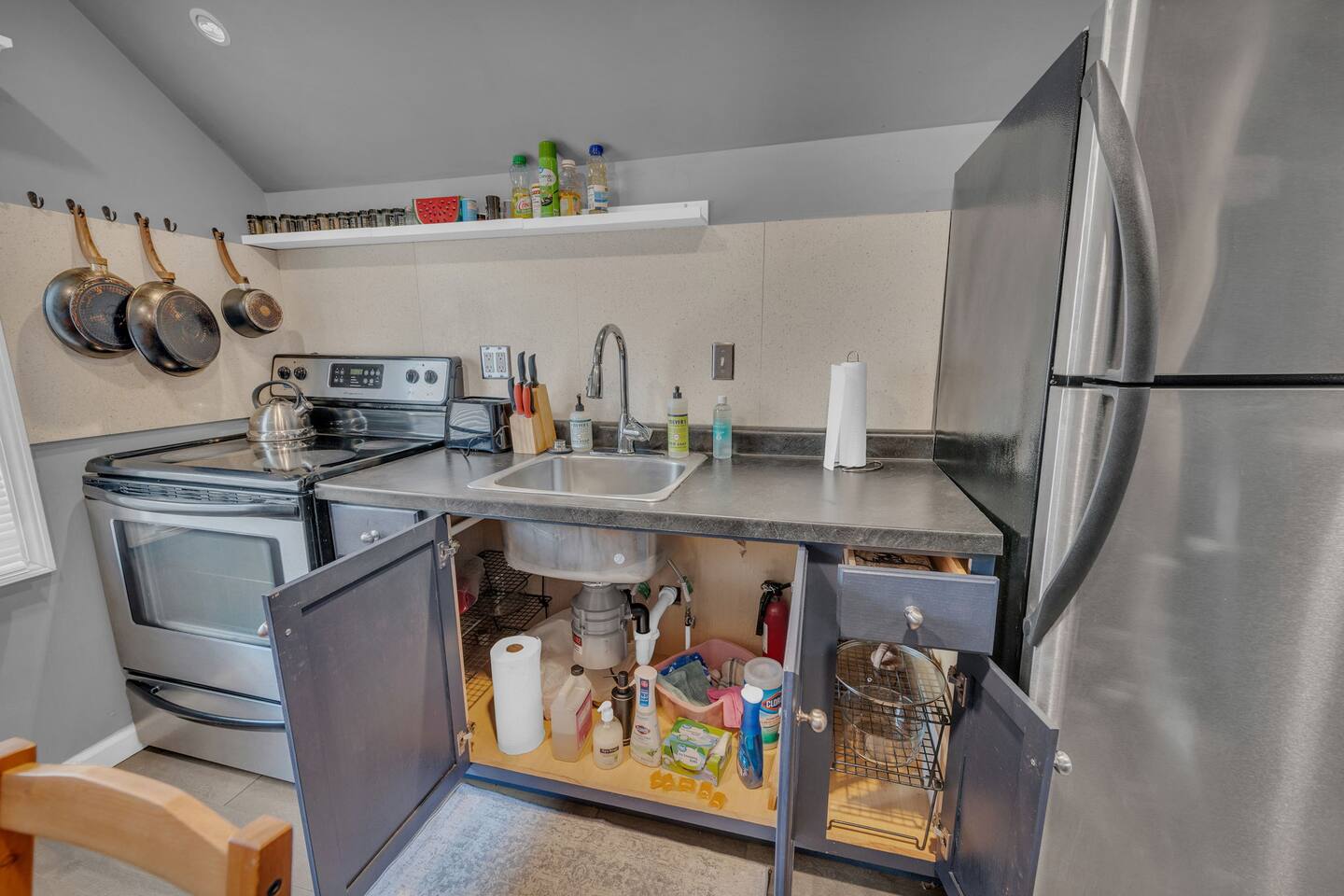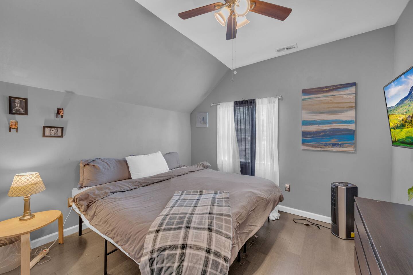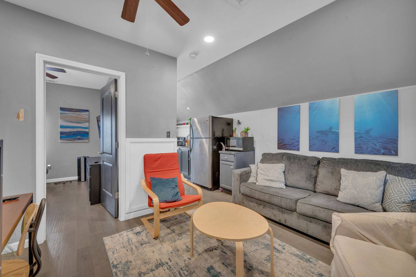 During your stay, you'll have exclusive access to the entire garage apartment, ensuring privacy and comfort. Enjoy the convenience of: Living Space: Relax in the spacious 1-bedroom, 1-bathroom apartment featuring a king bed in the bedroom and an air bed in the living room for additional guests. Work Area: Take advantage of the dedicated workspace located conveniently below the TV in the living room, providing a quiet and comfortable area to focus on tasks. Entertainment: Stay entertained with two TVs—one in the living room and another in the bedroom—offering a variety of viewing options for your enjoyment. Fully Equipped Kitchen: Prepare meals with ease in the well-appointed kitchen, equipped with all the necessary amenities to meet your culinary needs. Free Parking: Park your vehicle hassle-free in the designated parking space right in front of the apartment, ensuring convenient access at all times. Parking spot is located north of the house or the driveway which is facing the church/Orville street. Additionally, guests are welcome to access the washer and dryer located below the apartment in the garage area. Feel free to use these facilities to freshen up your belongings during your stay. We strive to provide everything you need for a comfortable and enjoyable experience. If you have any questions or special requests, don't hesitate to reach out. We're here to ensure your stay exceeds expectations.